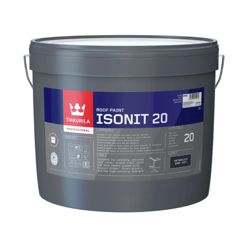 Isonit är en vattenburen färg för takbeläggning med utmärkt vidhäftning och kort torkningstid. Bra flödes- och utjämningsförmåga. Ytbehandlingen skapar en vattenavvisande yta som är diffusionsöppen, vilket gör att vattenånga som kommer inifrån materialet passerar igenom. Lätt, snabb och väderbeständig. Finns i både brytbara baser och fabrikstillverkade nyanser.